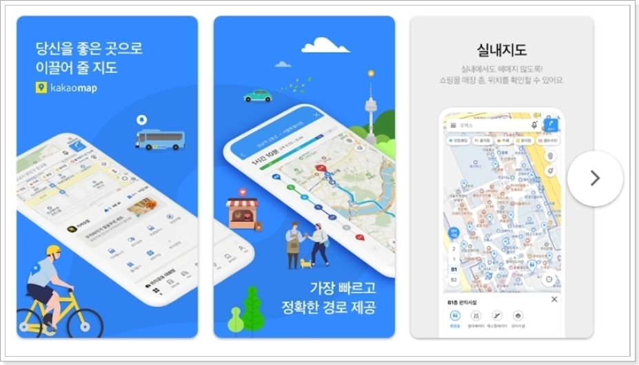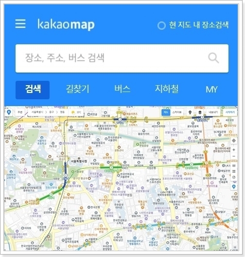 요즘은 다들 스마트폰으로 지도를 더 많이 보잖아요. 다음지도는 모바일에서는 ‘카카오맵’이라는 이름으로 제공돼요. 앱스토어나 플레이스토어에서 카카오맵을 설치하면 되는데요. 설치 후 실행만 하면 자동으로 현재 위치도 잡아주고 목적지 검색도 빠르게 가능하죠.