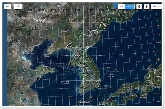 위성모드로 보려면 지도 오른쪽 상단에 있는 [지도] 메뉴를 클릭하면 '스카이뷰' 옵션이 보이는데요. 그걸 클릭하면 항공 사진처럼 실제 모습이 지도에 나타나요. 스카이뷰는 일반 위성지도보다 더 선명하고 실제 촬영된 사진을 기반으로 해서 입체감 있게 보여준다는 특징이 있어요.